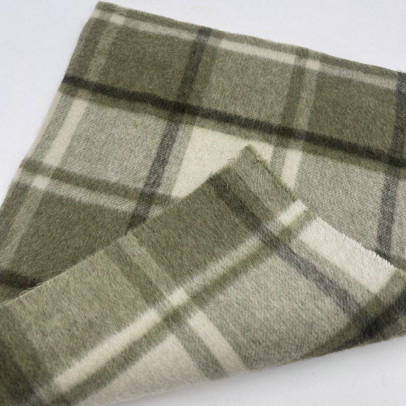 Detta tyg, betecknat som artikel ZZH25001, är en tjock vävd textil som består av 30 % ull och 70 % andra fibrer. Med en massa per ytenhet på 900 g/m uppvisar materialet betydande densitet och vikt. Ytan har ett grönt plädmönster med en skuggeffekt skapad genom specialiserade vävtekniker. Denna konstruktionsmetod ger skiktat visuellt djup i rutnätsformationen. Införandet av ullfibrer i blandningen påverkar tygets värmereglerande egenskaper. Dessa tekniska specifikationer resulterar i ett tungt vävt tyg som lämpar sig för strukturerade plagg där det krävs uttalad textur och betydande närvaro.