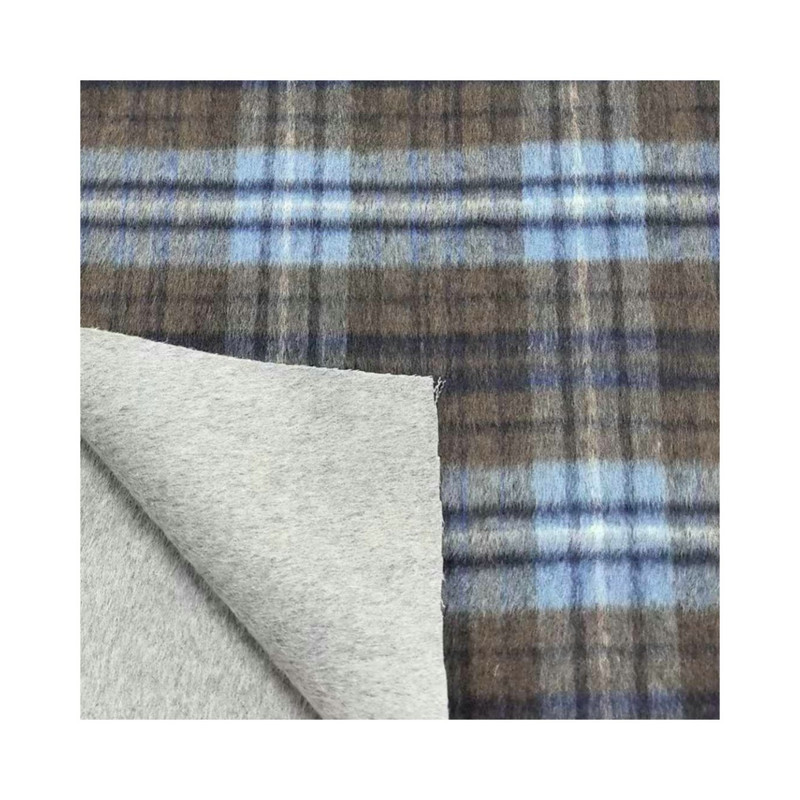 Detta tyg, betecknat som artikel ZZH25003, är en tung vävd textil som består av 50 % ull och 50 % andra fibrer. Med en massa per ytenhet på 950 g/m uppvisar materialet betydande densitet och vikt. Ytan har ett rutigt mönster som kombinerar blå och bruna toner i ett strukturerat rutnät. Denna viktkategori bidrar till tygets vindmotstånd och isoleringsförmåga. Ullblandningens sammansättning påverkar textilens värmereglerande egenskaper. Dessa tekniska specifikationer gör att det här vävda tyget kan användas för vinterjackor där ett betydande skydd mot kalla väderförhållanden krävs.