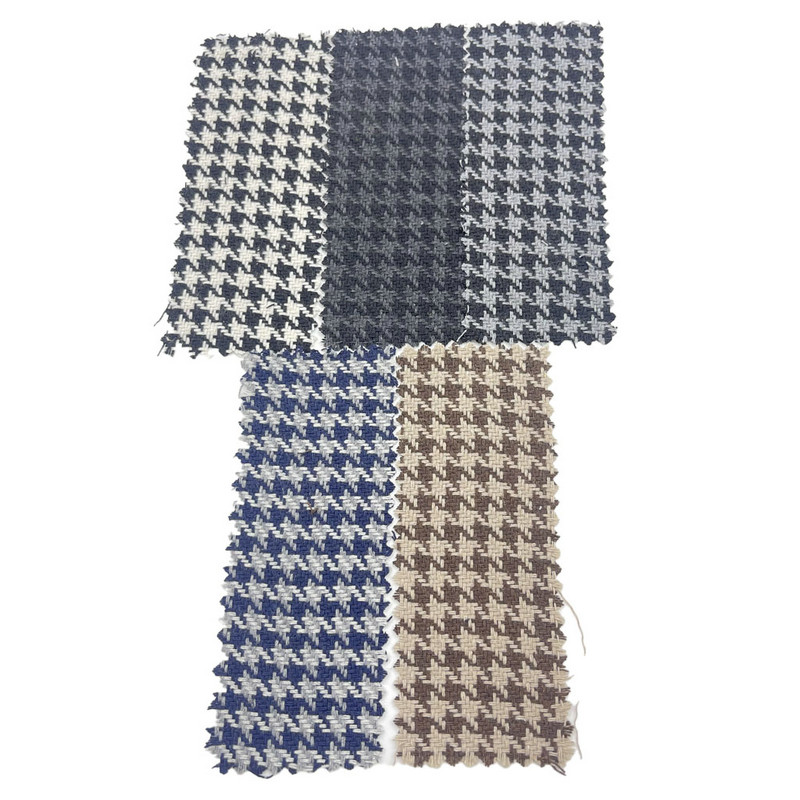 Detta tyg, betecknat som artikel 3946, är en vävd textil som består av 10 % ull och 90 % andra fibrer. Med en massa per ytenhet på 450 g/m ger den en medelviktig konstruktion. Den mörkgrå ytan har ett houndstooth-mönster, skapat genom en specifik vävteknik som ger brutna rutor eller fyruddiga former. Detta klassiska geometriska motiv kännetecknas av sin upprepande kontrasterande toneffekt. Ullblandningens sammansättning bidrar till tygets värmereglering och motståndskraft. Dessa tekniska egenskaper resulterar i ett material med definierad mönsterartikulation och strukturell hållbarhet, vilket gör det tillämpbart för hoodies där visuell mönsterdefinition och långtidsprestanda krävs.