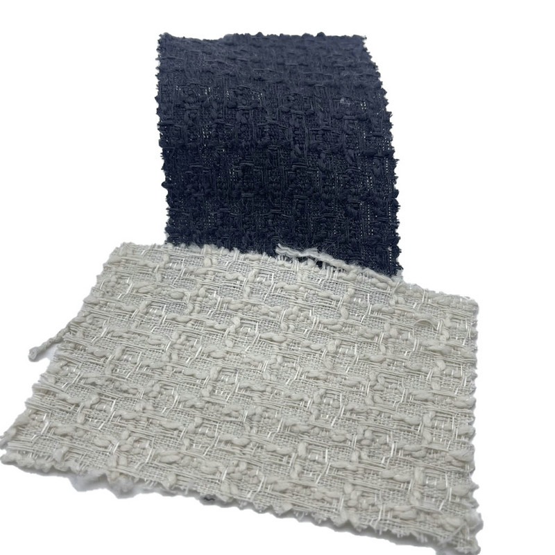 Detta tyg, betecknat som artikel 3786, är en tweedtextil som består av 10 % ull och 90 % andra fibrer. Med en massa per ytenhet på 500 g/m uppvisar den en medel- till tung konstruktion. Ytan har ett svart och vitt rutigt mönster förstärkt av en präglingsprocess. Denna teknik skapar en upphöjd textur på specifika områden av rutnätet, vilket ger en tredimensionell effekt till den geometriska designen. Ullblandningens sammansättning bidrar till tygets värmereglering och formbevarande. Dessa tillverkningstekniker resulterar i ett material med förbättrat visuellt djup och strukturell integritet, vilket gör det tillämpbart för kappor där ytstruktur och mönsterdefinition krävs.