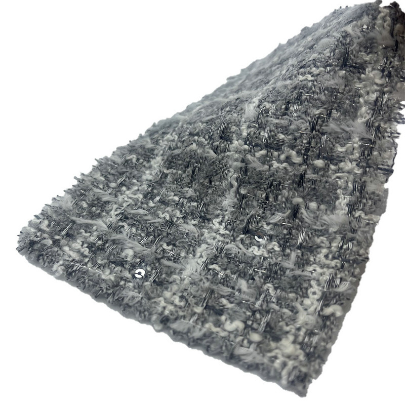 Detta tyg, betecknat som artikel 23503, är en tweedtextil som består av 49 % akryl, 40 % polyester, 7 % ull och 4 % nylon. Med en massa per ytenhet på 335 g/m² presenterar den en lätt men ändå strukturerad konstruktion. Ytan har ett fint grått rutigt mönster, uppnått genom en präglingsprocess som skapar en subtil upphöjd struktur på tyget. Denna teknik förbättrar plädens visuella djup utan att ändra den vävda basen. Multifiberblandningen kombinerar stabiliteten hos polyester, motståndskraften hos akryl, naturlig touch av ull och hållbarheten hos nylon. Dessa egenskaper gör tyget lämpligt för damplagg där detaljerade mönster och taktilt intresse krävs.