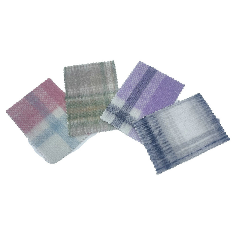 Detta tyg, betecknat som artikel 3940, är en jacquardtextil som består av 10 % ull och 90 % andra fibrer. Med en massa per ytenhet på 600 g/m ger den en tung konstruktion. Den lila ytan kombinerar ett rutigt mönster med en lång luggstruktur, uppnådd genom specialiserade jacquardvävnings- och efterbehandlingstekniker. Denna tillverkningsprocess skapar förlängda fiberöglor på tygytan, vilket resulterar i en uttalad tredimensionell struktur. Ullblandningens sammansättning bidrar till tygets värmeisolerande egenskaper och motståndskraft. Dessa tekniska egenskaper ger ett material med betydande djup och ytvolym, vilket gör det tillämpbart för överdrag där förhöjd värme och strukturella dimensioner krävs.