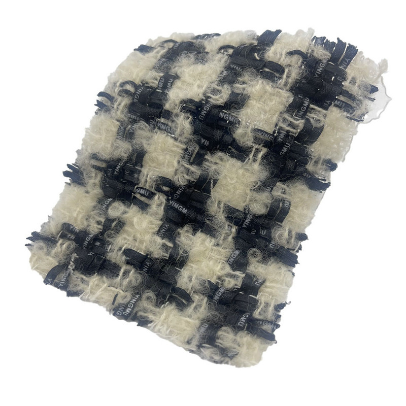 Detta tyg, betecknat som artikel 23548, är en tweed-textil av ull som består av 38 % polyester, 36 % ull och 26 % bomull. Med en massa per ytenhet på 410 g/m² ger den en medelviktig konstruktion. Det benvita och svarta färgschemat vävs in i ett rutigt mönster, förstärkt av en ytborstningsteknik som skapar en upphöjd teddyliknande struktur. Denna efterbehandlingsprocess bildar en tät, korthårig yta som förändrar tygets taktila egenskaper. Fibersammansättningen bidrar till tygets strukturella stabilitet och fukthantering. Dessa egenskaper gör denna borstade tweed användbar för plagg som kräver både visuell mönsterdefinition och distinkt ytstruktur.