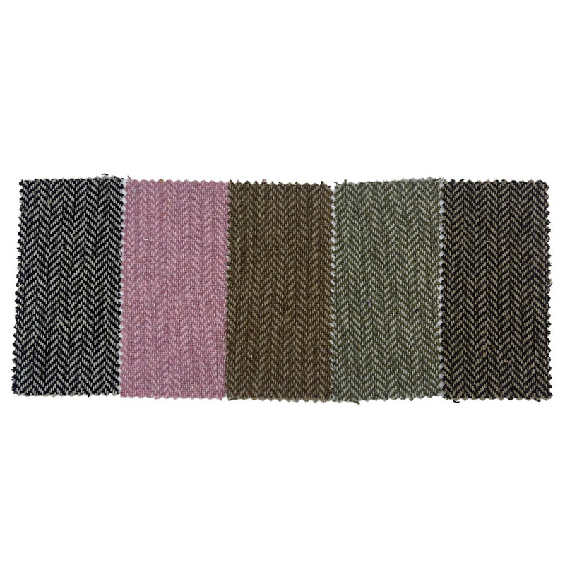 Detta tyg, betecknat som artikel 3532, är en jacquardtextil som består av 20 % ull och 80 % andra fibrer. Med en massa per ytenhet på 500 g/m har den en medel- till tung konstruktion. Den rosa ytan har ett fiskbensmönster skapat genom jacquardvävprocessen, som bildar exakta V-formade motiv över tyget. Denna teknik ger en konsekvent riktningstextur med definierad geometrisk upprepning. Ullblandningens sammansättning bidrar till tygets termiska egenskaper och formbevarande. Dessa tekniska egenskaper resulterar i ett material med strukturell täthet och mönstertydlighet, vilket gör det tillämpbart för byxor där både visuell definition och dimensionsstabilitet krävs.