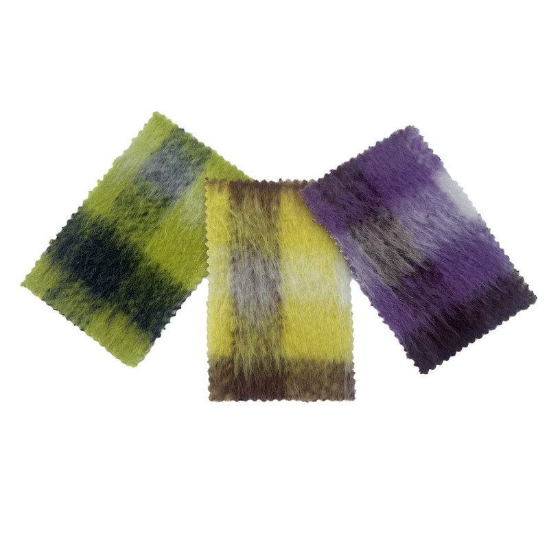 Detta tyg, betecknat som artikel 3256, är en tweedtextil som består av 20 % ull och 80 % andra fibrer. Med en massa per ytenhet på 700 g/m ger den en tung konstruktion. Den lila ytan har ett rutigt mönster integrerat med en lång luggstruktur, vilket skapar en sammansatt struktur genom specialiserade vävnings- och efterbehandlingsprocesser. Denna tillverkningsteknik ger utökad fiberlängd på ytan, vilket resulterar i en uttalad tredimensionell effekt. Ullblandningens sammansättning bidrar till tygets värmeisolerande egenskaper och strukturella motståndskraft. Dessa tekniska egenskaper resulterar i ett material med betydande volym och ytdjup, vilket gör det användbart för överrockar där förhöjd värme och strukturell närvaro krävs.