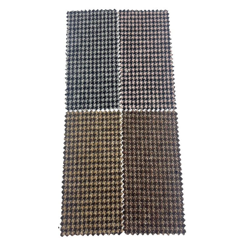 Detta tyg, betecknat som artikel 4334, är en vävd tweedtextil som består av 35 % ull och 65 % andra fibrer. Med en massa per ytenhet på 450 g/m ger den en medelviktig konstruktion. Ytan kombinerar ett houndstooth-mönster med rutiga element, vilket skapar en sammansatt geometrisk design genom exakta vävtekniker. Denna konstruktionsmetod ger sammankopplade brutna rutor med definierad färgkontrast över tyget. Ullblandningskompositionen bidrar till tygets formstabilitet och rynkbeständighet. Dessa tekniska egenskaper resulterar i ett material med intrikat mönsterartikulation och strukturell hållbarhet, vilket gör det tillämpbart för byxor där detaljerade mönster och långtidsprestanda krävs.
